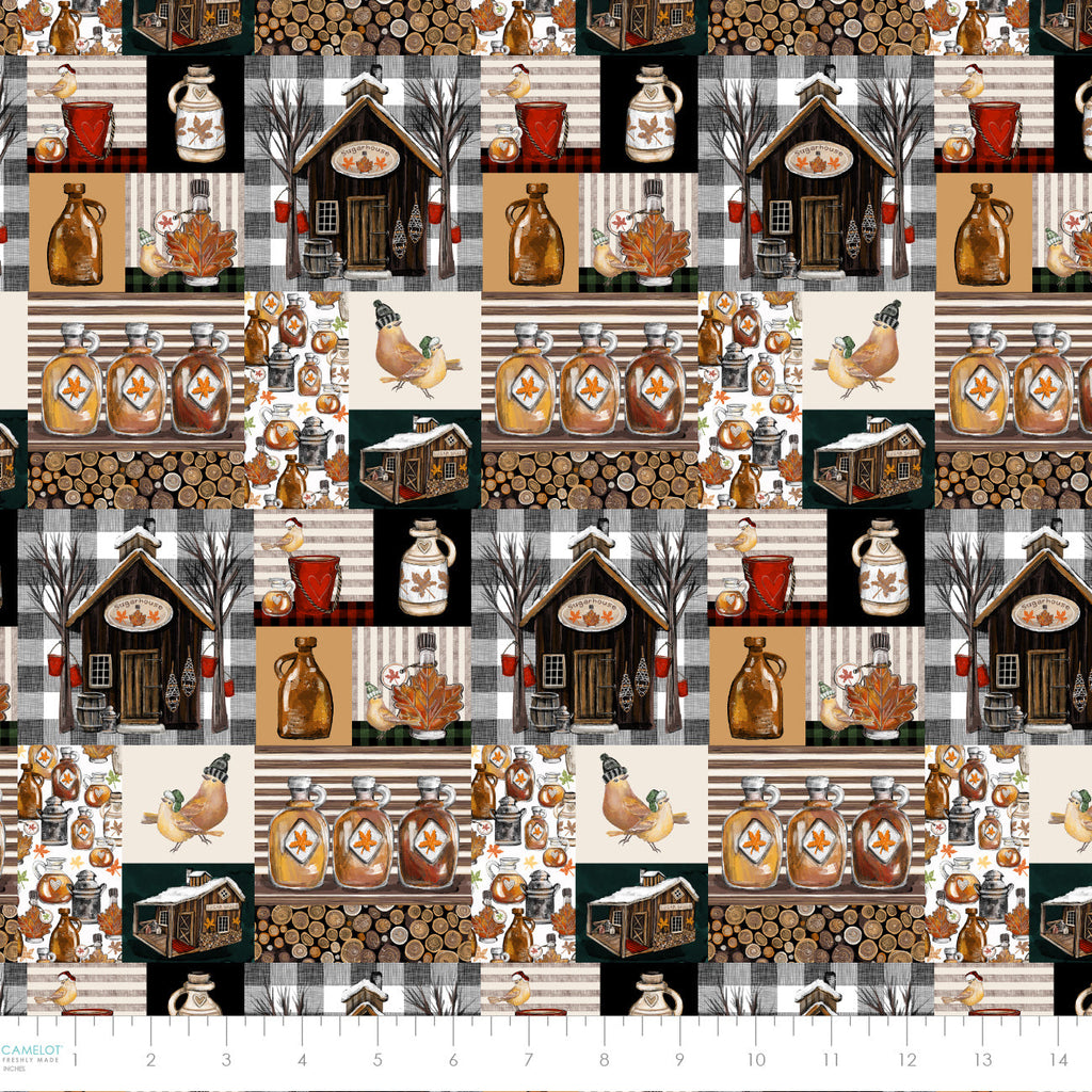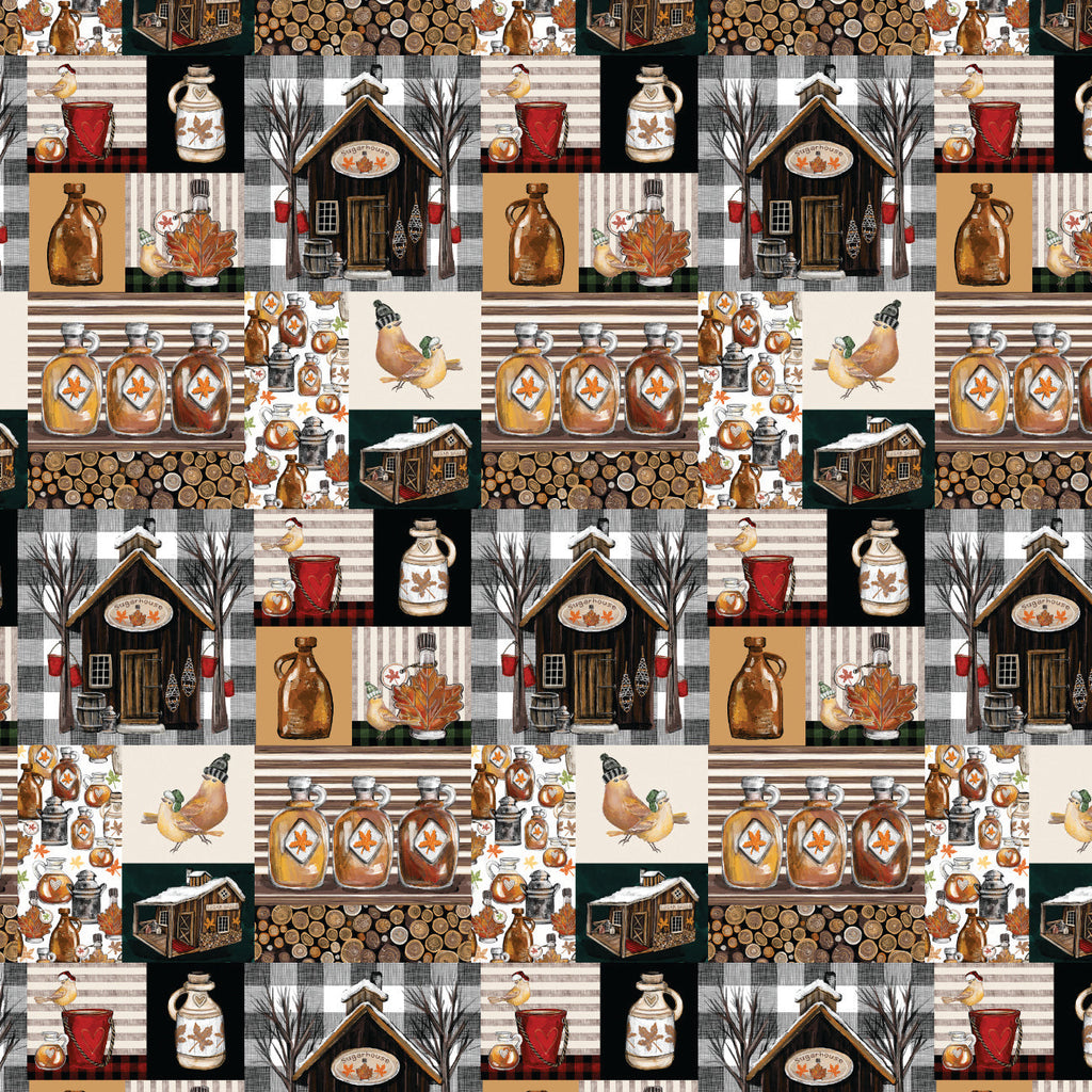 Discover the charm of Fun on Tap, a quilting cotton fabric collection that offers a contemporary twist on a traditional rustic sugar shack. Inspired by the cozy ambiance of a maple syrup farm, this collection features playful birds, sugaring off patchwork, maple syrup motifs, wood grain textures, classic buffalo plaid and a sugaring off panel to round out the assortment, making this collection perfect for creating heirloom pieces to celebrate this beloved tradition.